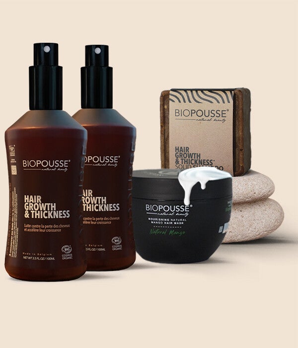 Notre shampoing solide et masque nourrissant pour accompagner votre lotion Biopousse. À trois, ils sont plus forts pour soigner vos cheveux, les rendre encore plus vigoureux, plus forts,… jamais 2 sans 3